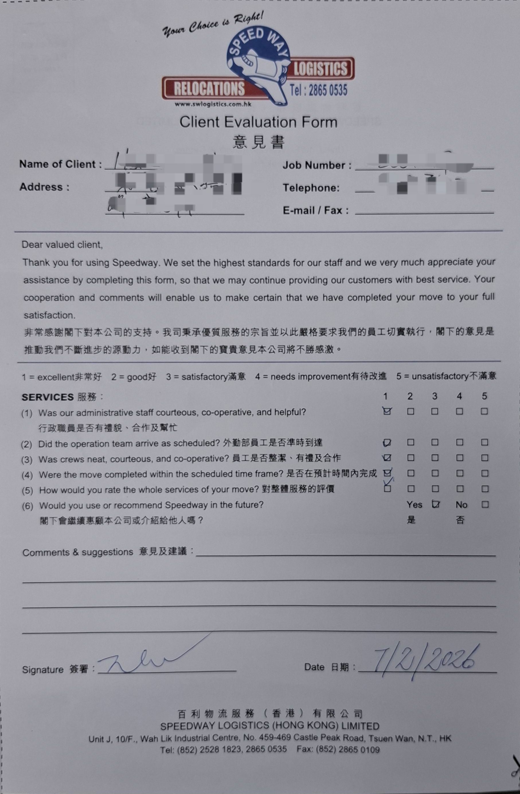 客戶羅小姐從香港屯門村屋搬家到台灣桃園,感謝透過台灣社群推薦,委託百利物流Speedway Logistics (HK) Ltd負責門到門 香港桃園包裝搬運物流服務 (HK to Taoyuan Relocation Service ) Thanks Ms. Sandy Your Choice is Right !